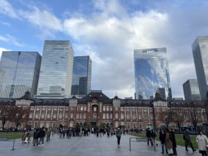 高いビルと赤レンガ駅舎。新しい物と古い物とが違和感なく存在する東京駅、やっぱり素敵ですね😊